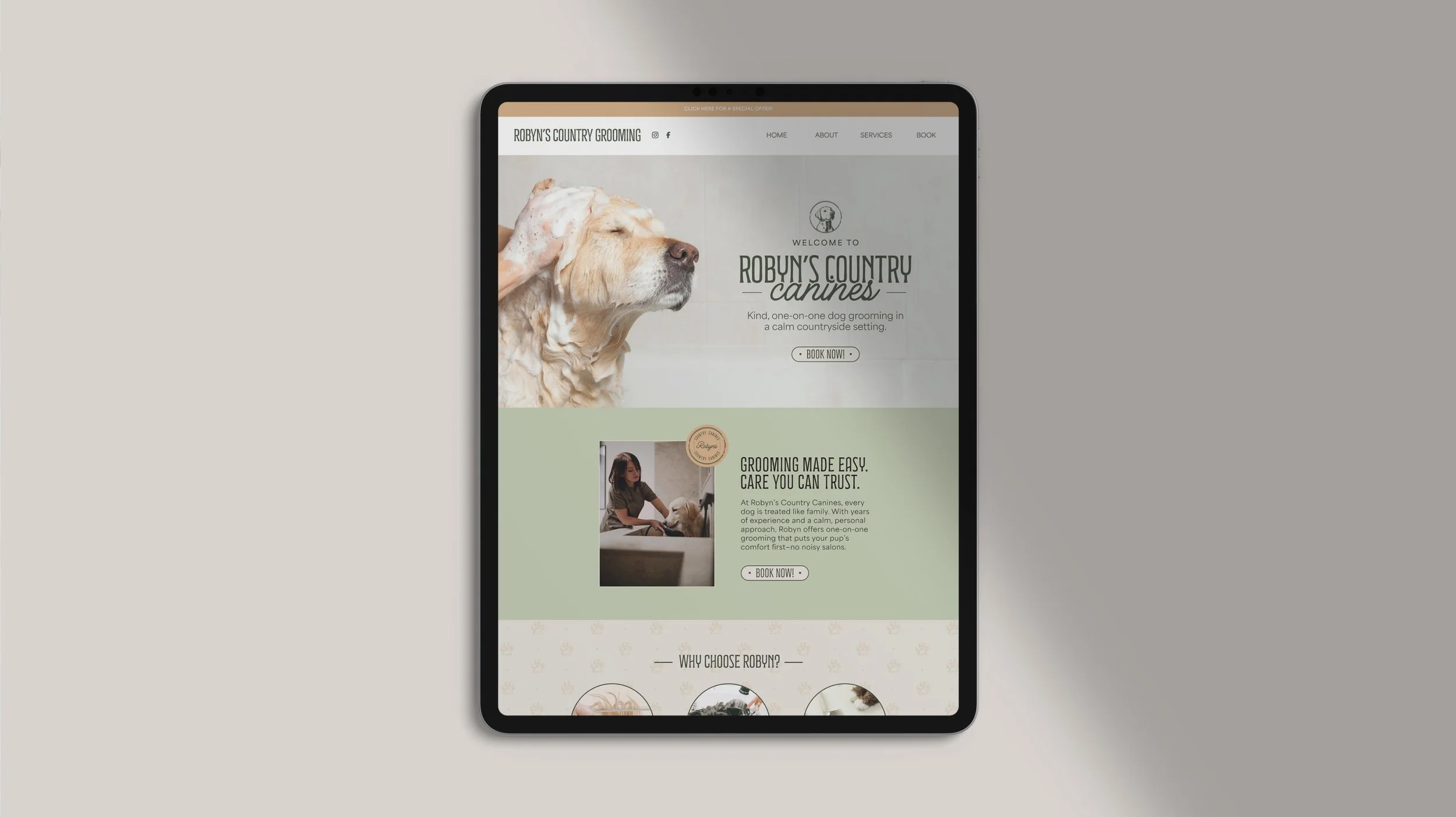 Robyn’s County Canines is a calm, dog-first grooming space that values owner trust and connection. We worked together to develop the brand’s visual identity, online presence and launch collateral.